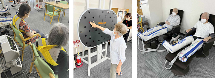 運動ばかりでは疲労も出てしまいますので、リラクゼーションの機器として、メドマー(空気圧で下肢のマッサージ)、ホットパック(筋肉の暖め)、骨盤マッサージ機などで血流の促進や筋肉のほぐしを行います。
