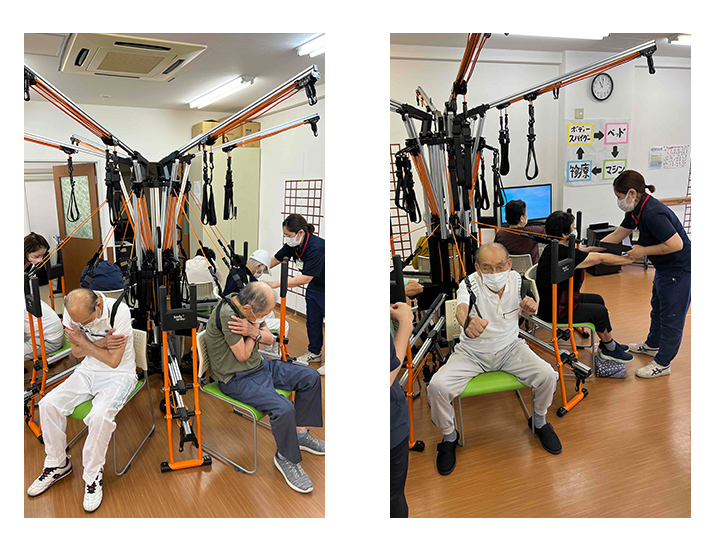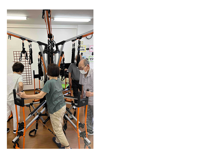 またバランスを整えるためいろんな筋肉や関節を同時に刺激できることが特徴です。その運動を行うためボディー・スパイダーを導入しました。運動強度はご利用者に合わせて実施していきます。(座位・立位・ゴムの強度)