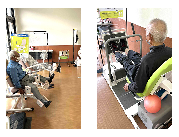 通所介護フィットネスデイYスタ西原では、立ち上がりや歩行を意識した下肢中心を刺激するマシンを導入しています。